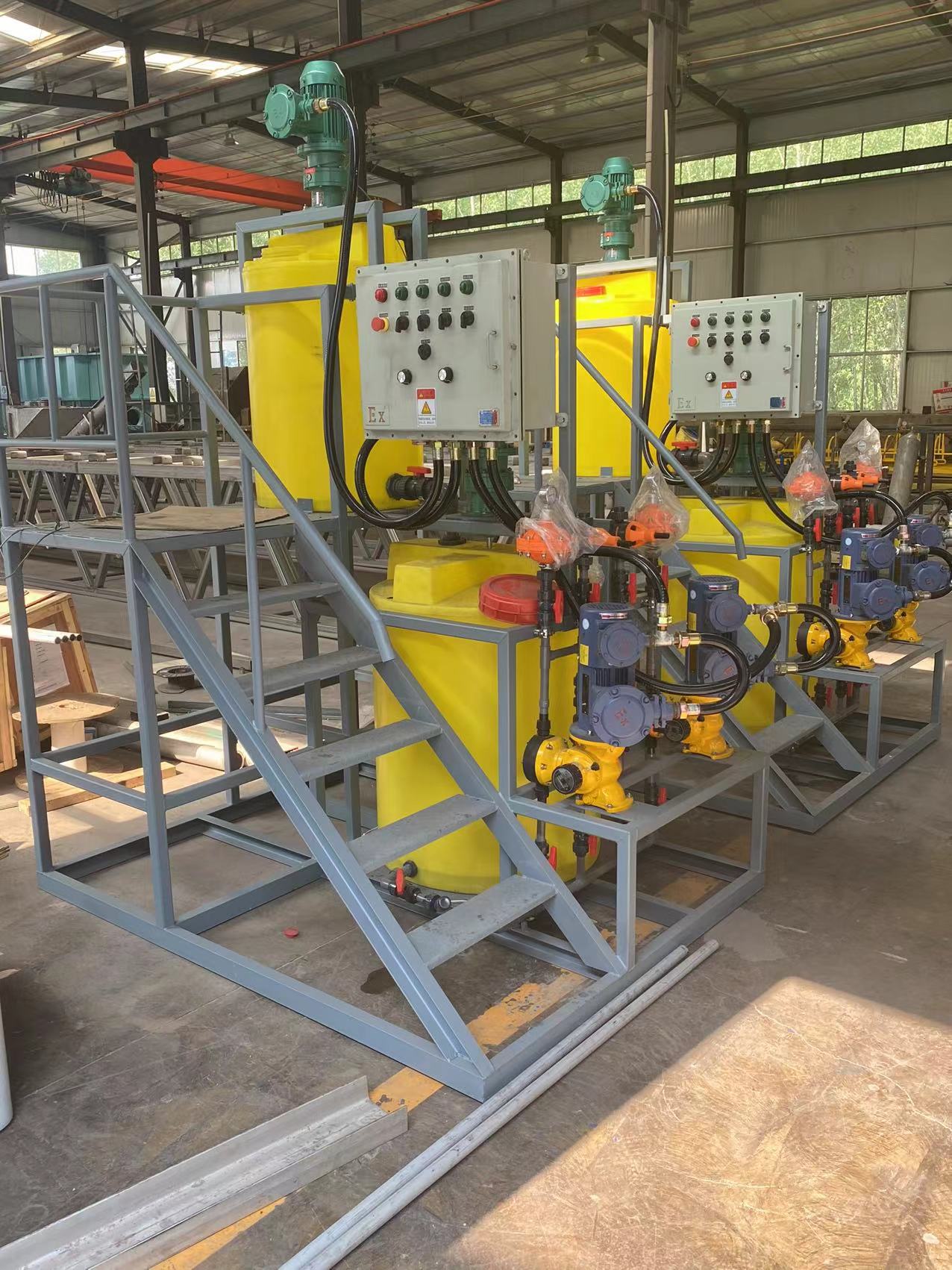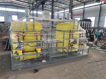 加药装置是以计量泵为主要投加设备、将溶药箱、搅拌器、液位计、安全阀、止回阀、压力表、过滤器、缓冲器、管路、阀门、底座、扶梯、自动监视系统、电力控制系统等按工艺流程需要组装在一个公共平台上,形成一个模块,即所谓的撬装式组合式单元。