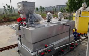 加药装置,采用的是机电一体化结构形式,从安装上可分为固定式和移动式(推车式),每种形式的加药装置均配有搅拌系统、加药系统和自动控制系统。几个固定式撬装可组合成一个整体,加上变频控制系统,可实现就地控制、远程自动控制、手动和自动相互转换加药。具有结构紧凑,体积小、噪音低、工作平稳、安装简单、操作使用方便等优点。